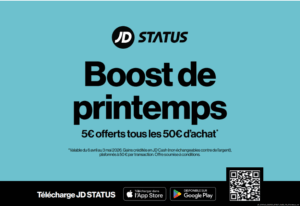 Retour Boost de printemps Du 06 avril 2026 Au 03 mai 2026. Du 6 avril au 3 mai 2026, les membres JD STATUS bénéficient de 5€ offerts tous les 50€ d’achat* Retour à la liste